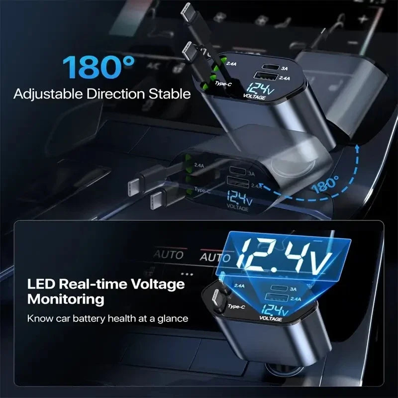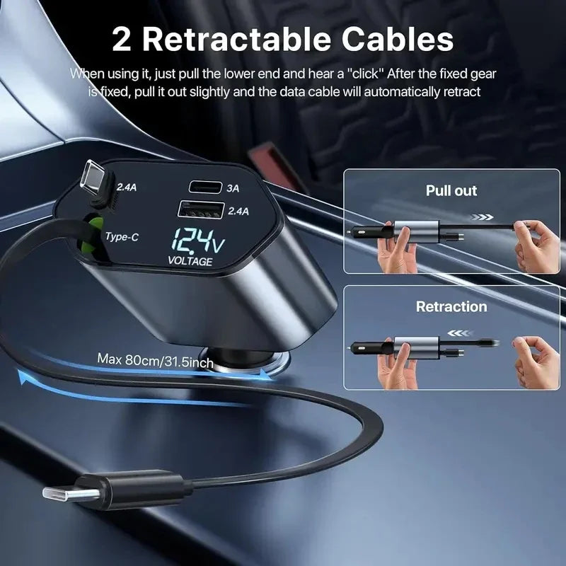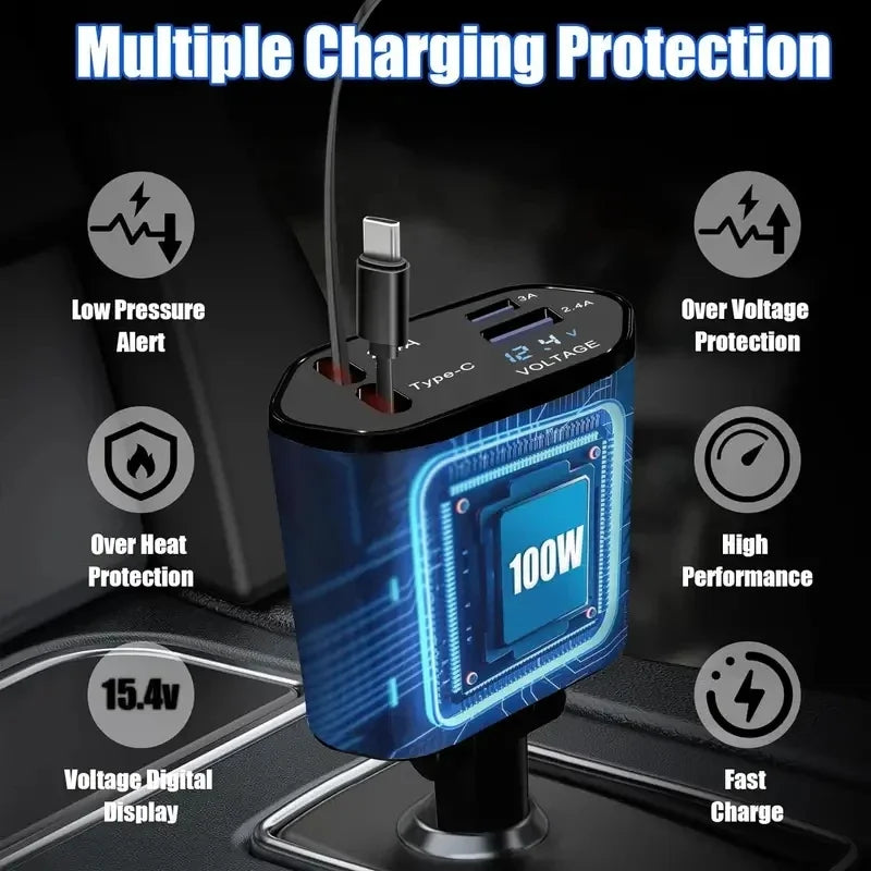 Retractable Car Charger 4 in 1 Fast Charging 100W USB Type C Car Phone Charge For iPhone 15 14 Xiaomi Samsung iPad Laptop Tablet